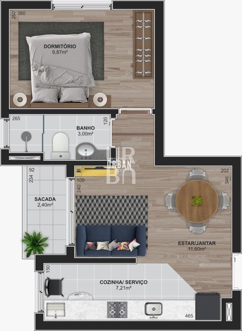 Descrição › Apartamento mobiliado com 01 dormitório privativo, sala de estar, jantar e cozinha integrados, 01 banheiro, área privativa de 41,31m, box de garagem n 97, 02 elevadores e área coletiva com lavanderia e bicicletário.