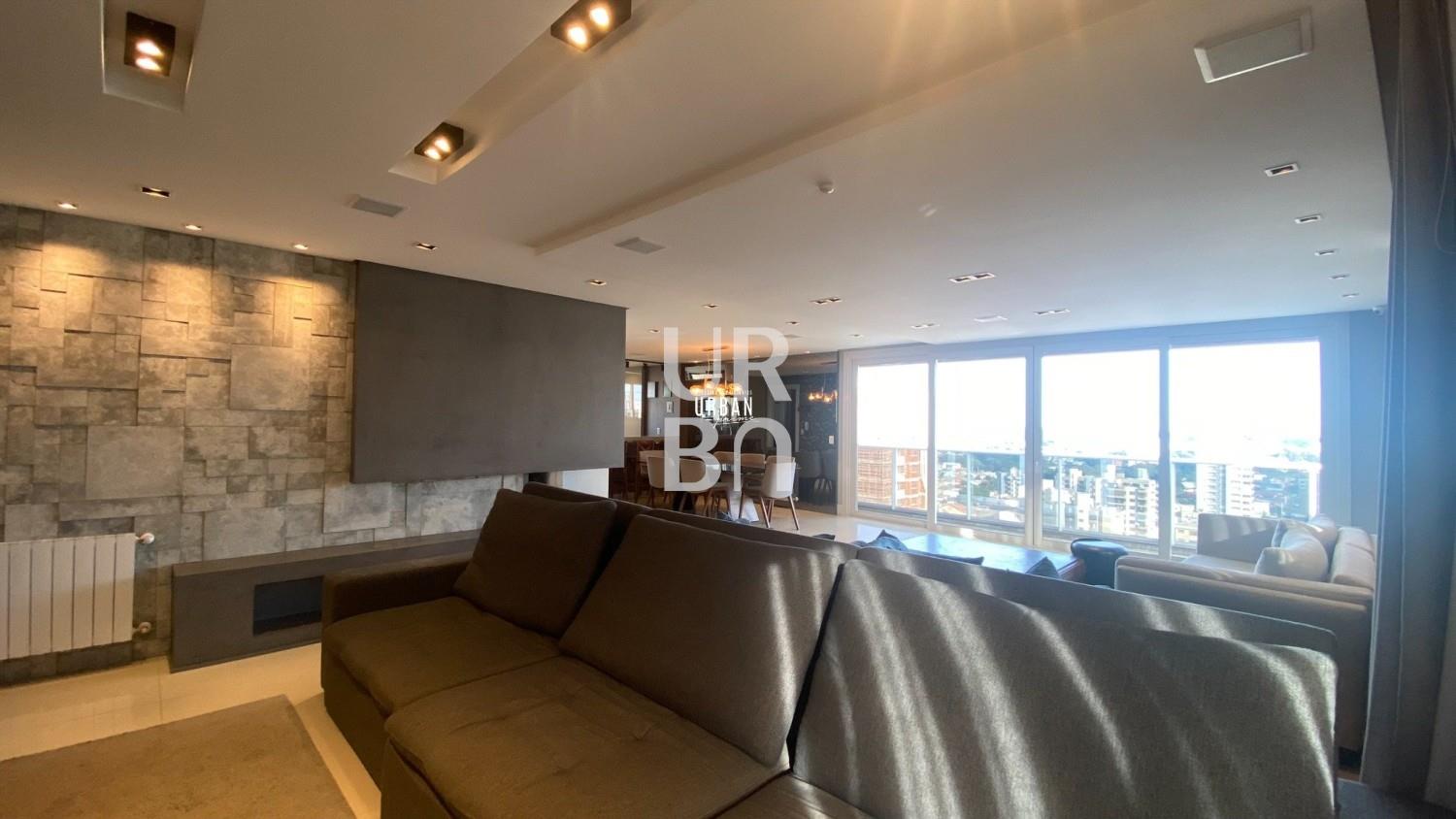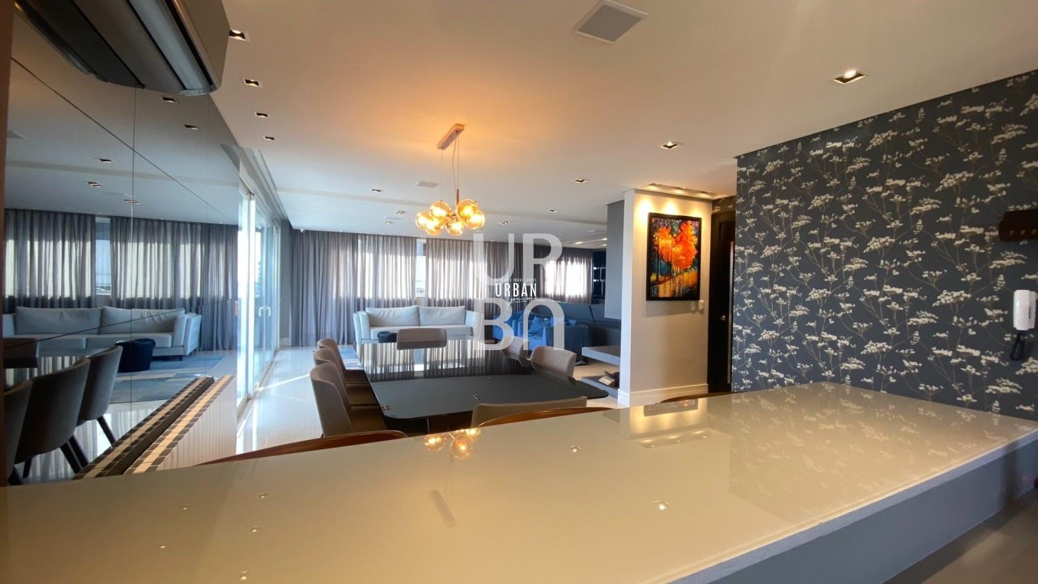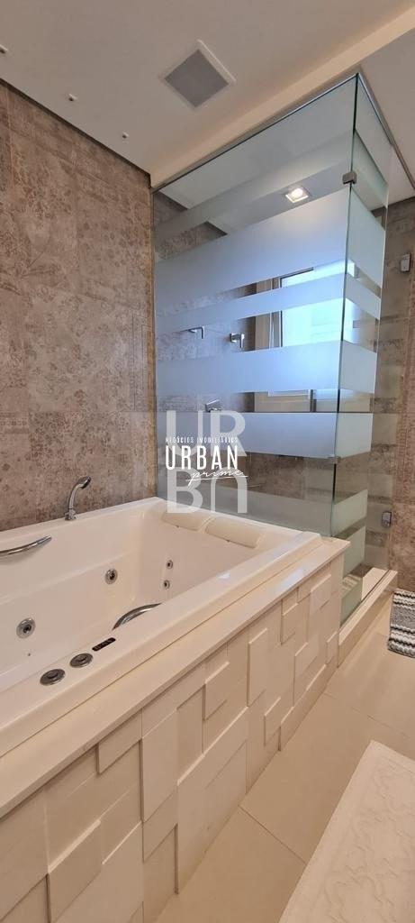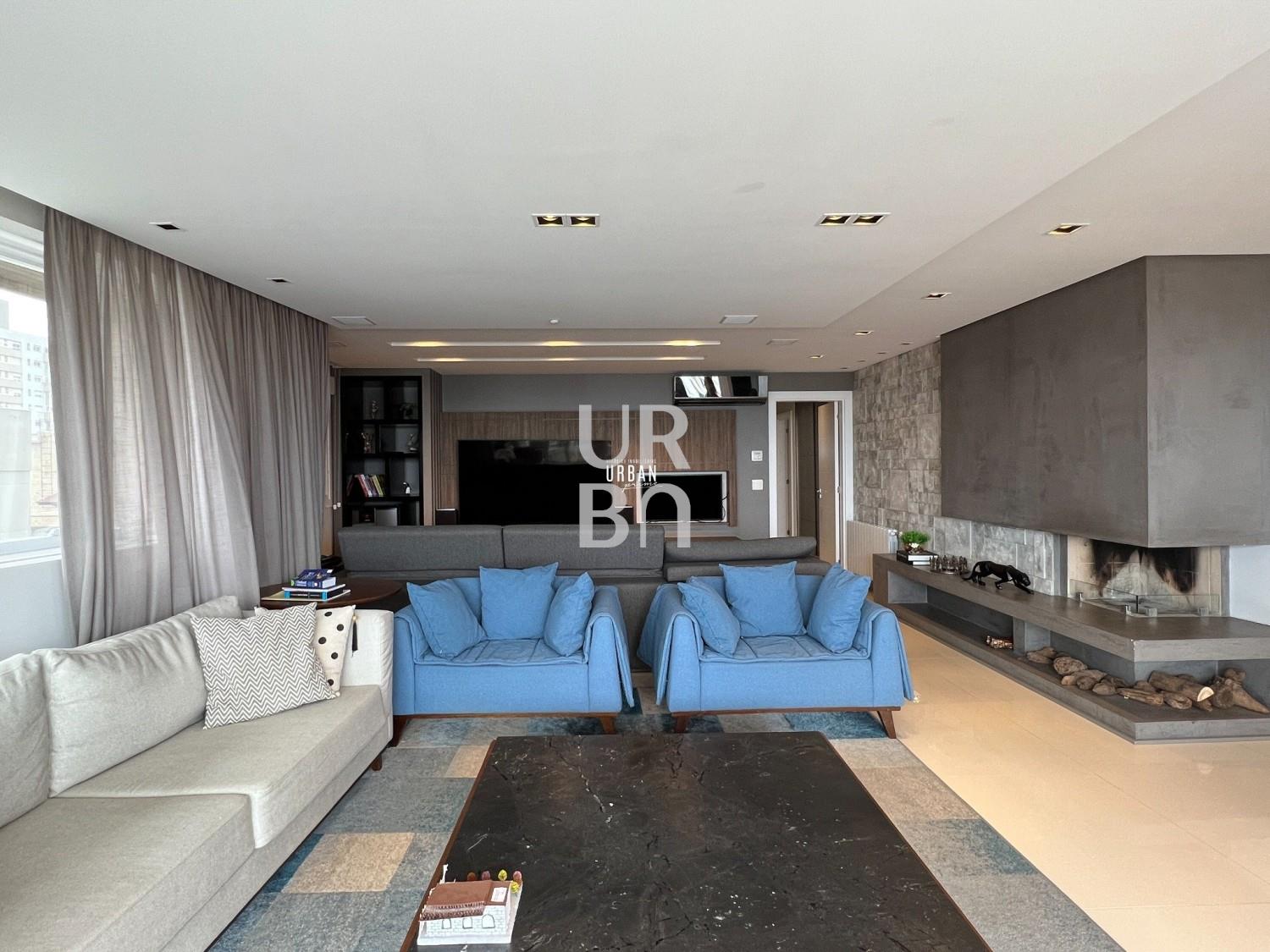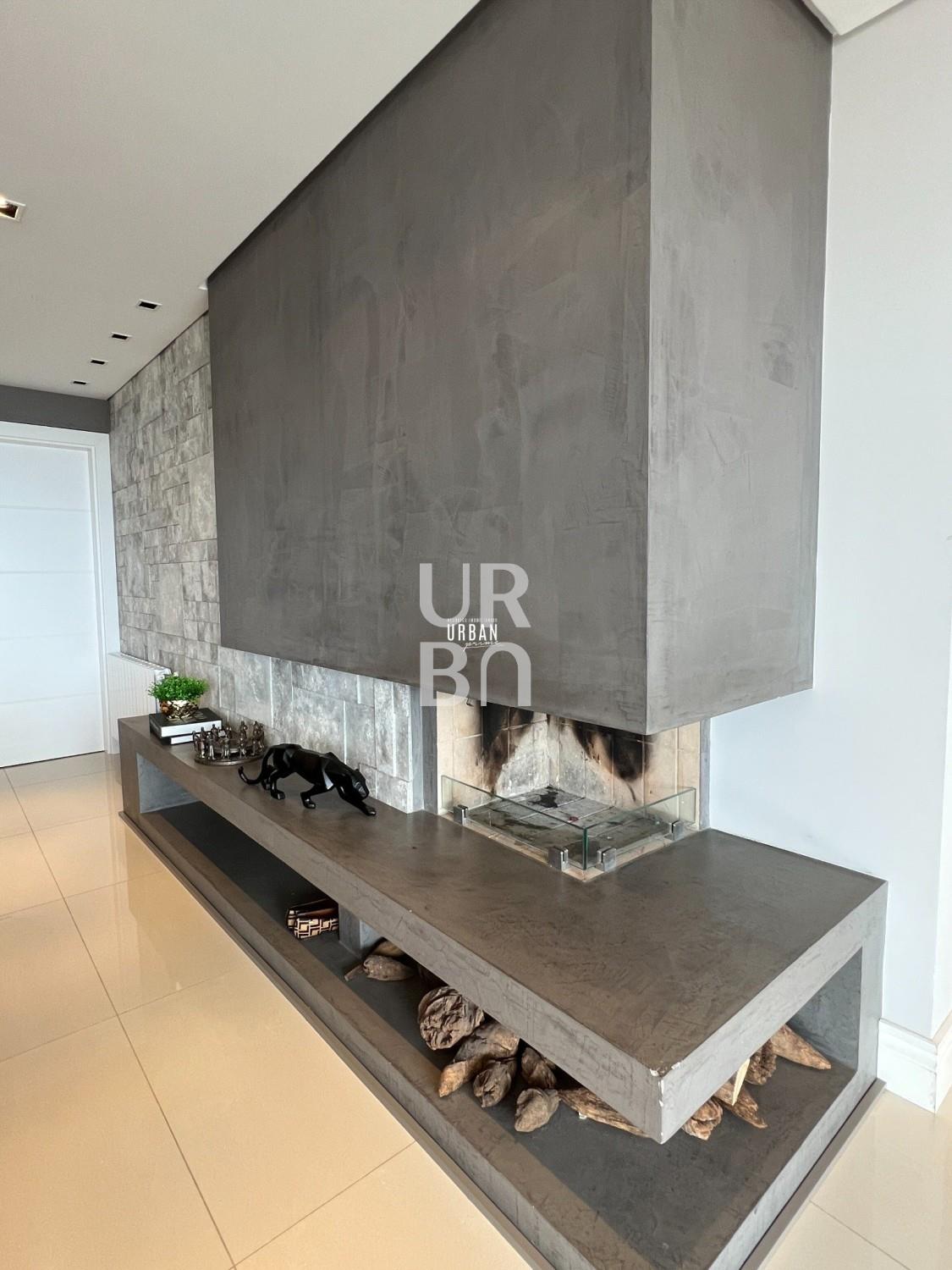Descrição › Apartamento Vernazza Residensiale mobiliado e decorado, apenas 1 apartamento por andar, hall de entrada com porta blindada, andar alto com vista panorâmica para a cidade, possui 3 suítes, sendo 1 master com closet e hidromassagem, 5 banheiros, amplo living social com 3 ambientes, cozinha americana com churrasqueira, lareira a lenha, possui automação em todo apartamento e excelente posição solar e 4 vagas de garagem.