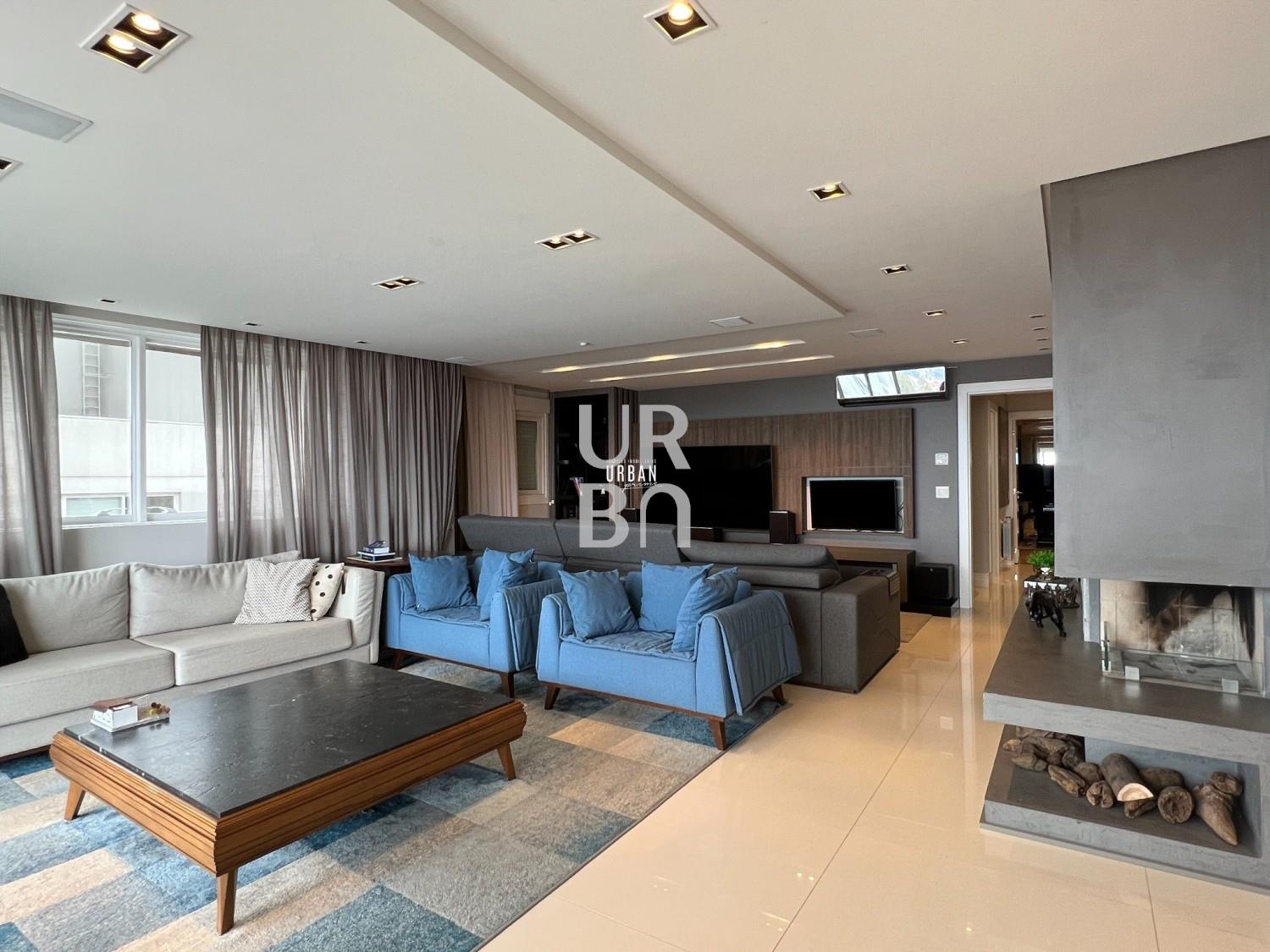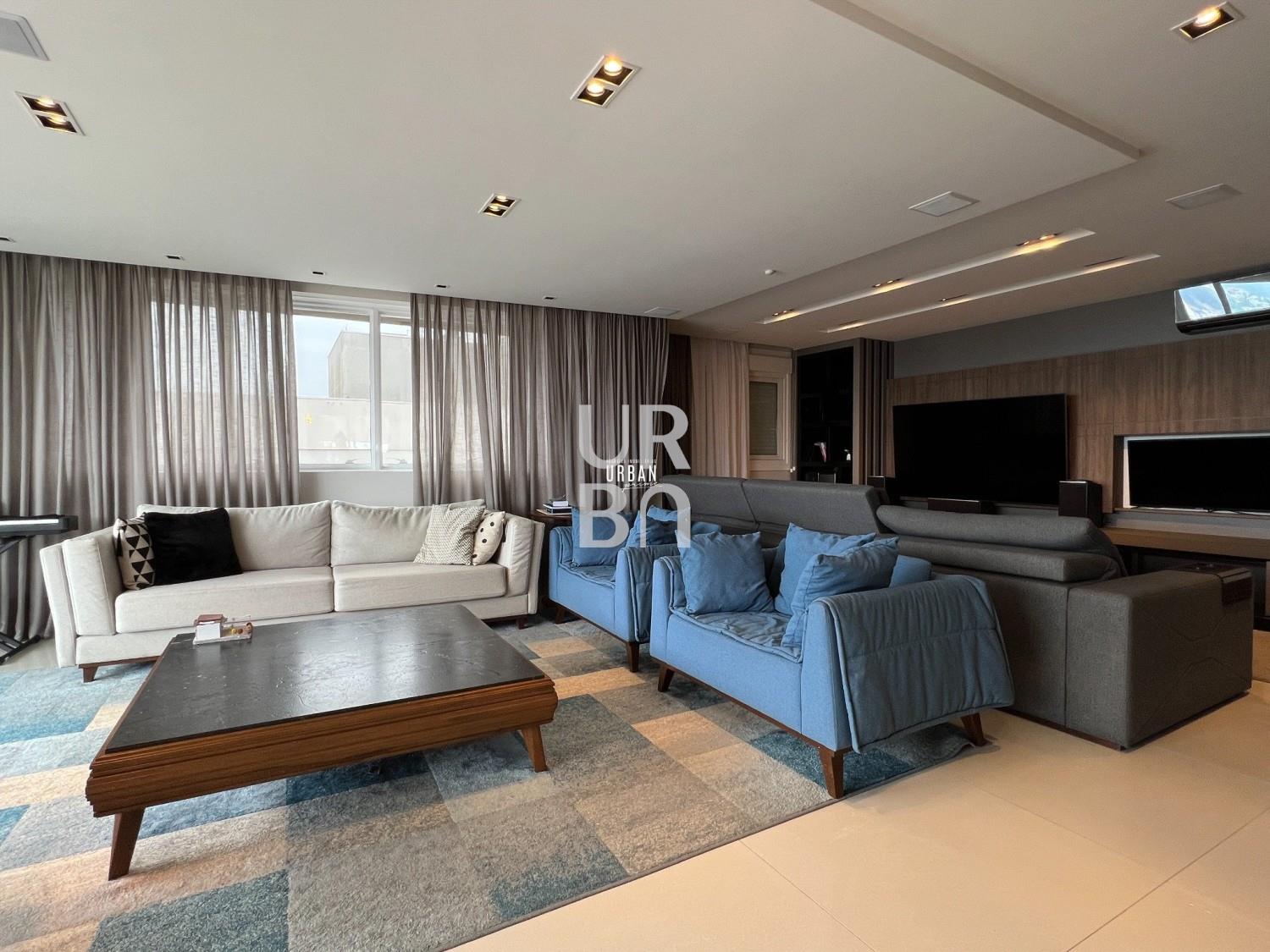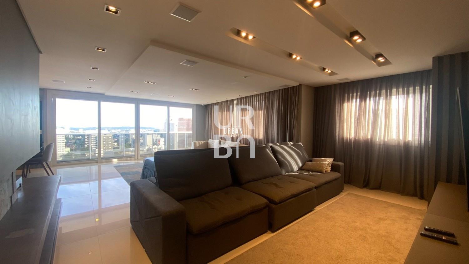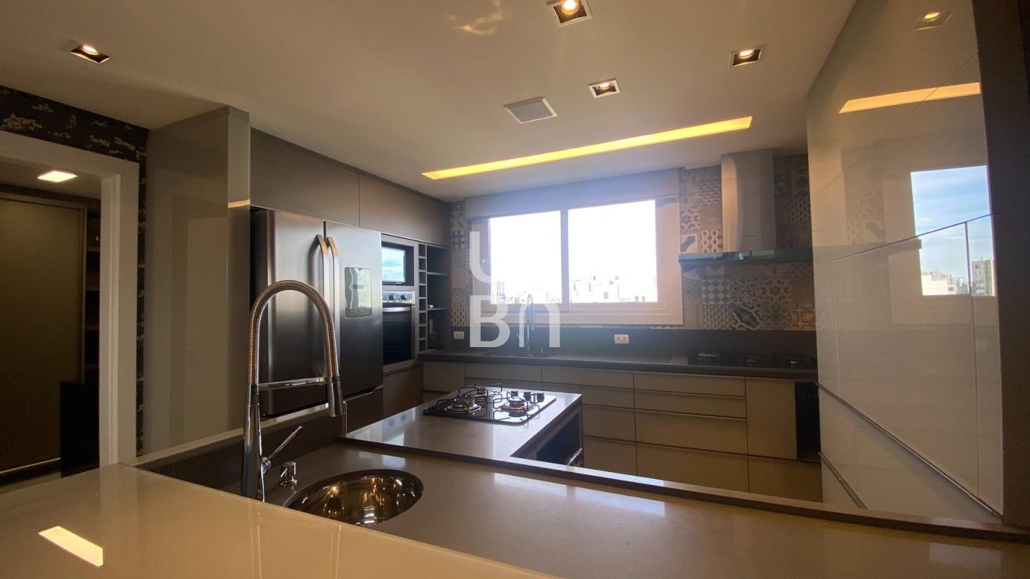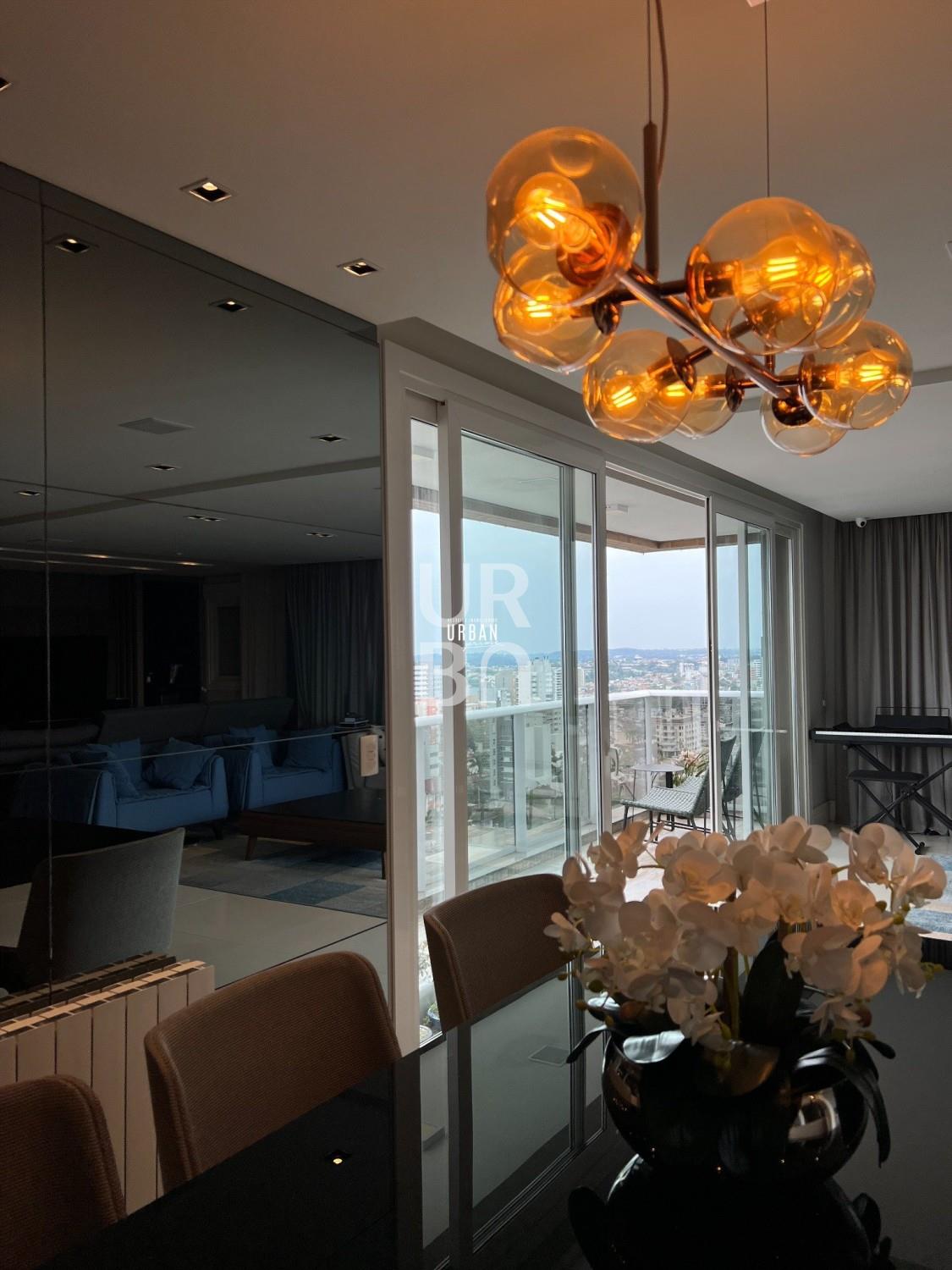 Descrição › Apartamento Vernazza Residensiale mobiliado e decorado, apenas 1 apartamento por andar, hall de entrada com porta blindada, andar alto com vista panorâmica para a cidade, possui 3 suítes, sendo 1 master com closet e hidromassagem, 5 banheiros, amplo living social com 3 ambientes, cozinha americana com churrasqueira, lareira a lenha, possui automação em todo apartamento e excelente posição solar e 4 vagas de garagem.