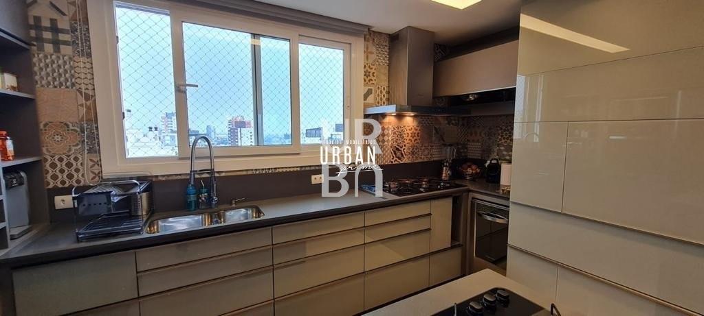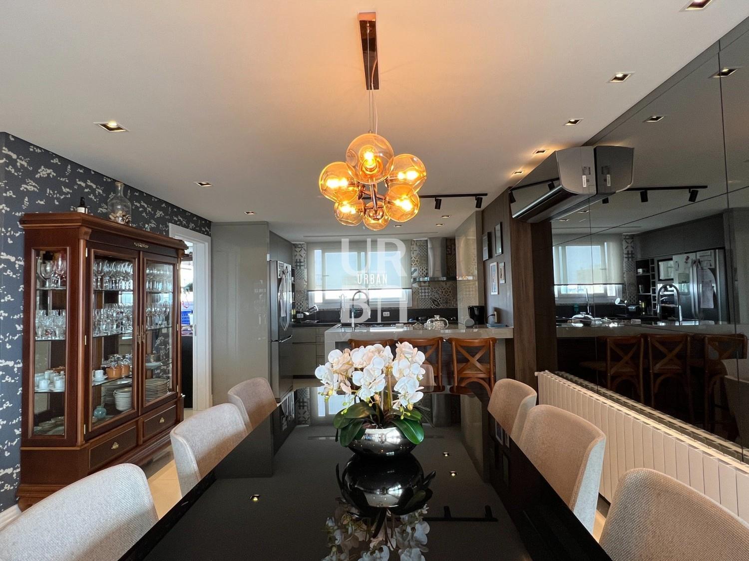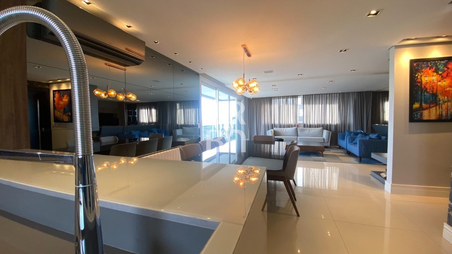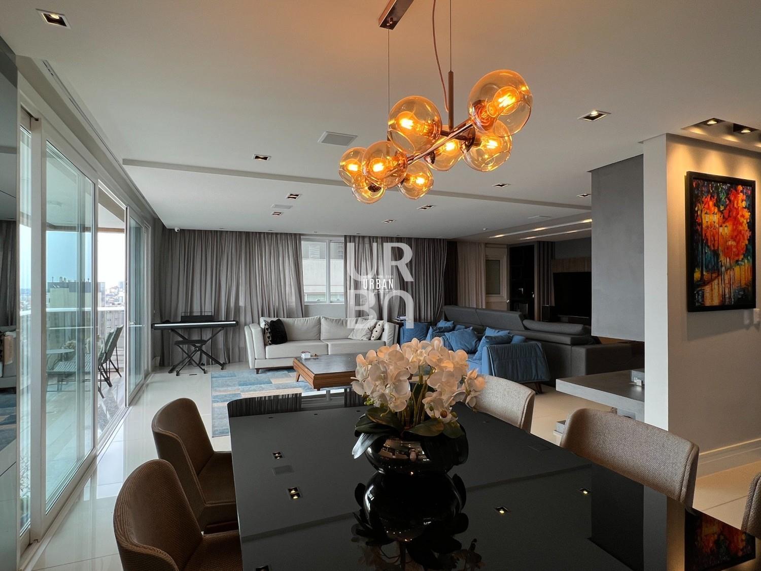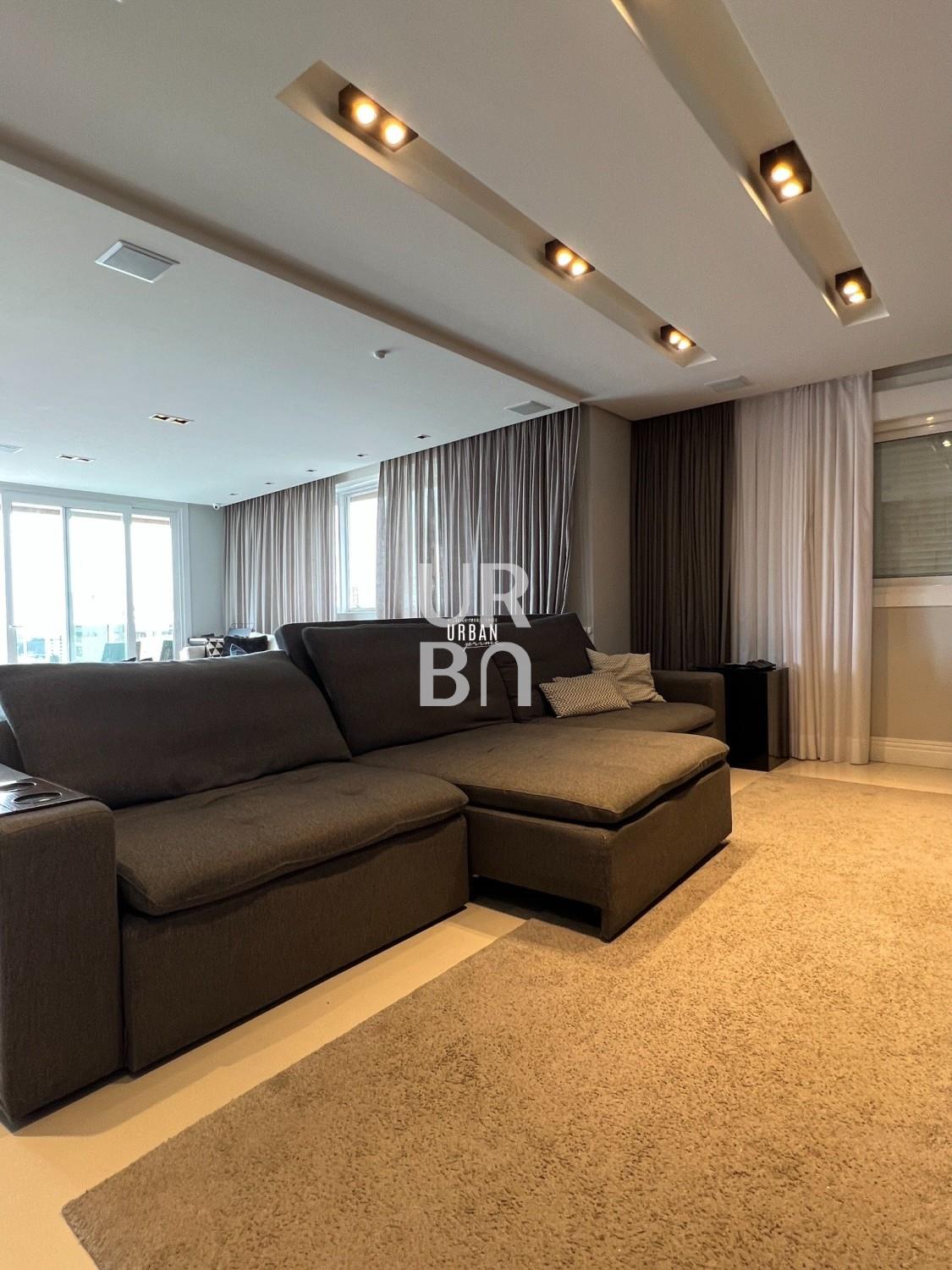 Descrição › Apartamento Vernazza Residensiale mobiliado e decorado, apenas 1 apartamento por andar, hall de entrada com porta blindada, andar alto com vista panorâmica para a cidade, possui 3 suítes, sendo 1 master com closet e hidromassagem, 5 banheiros, amplo living social com 3 ambientes, cozinha americana com churrasqueira, lareira a lenha, possui automação em todo apartamento e excelente posição solar e 4 vagas de garagem.