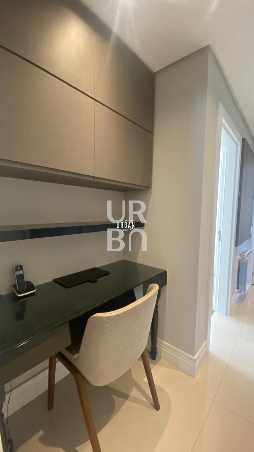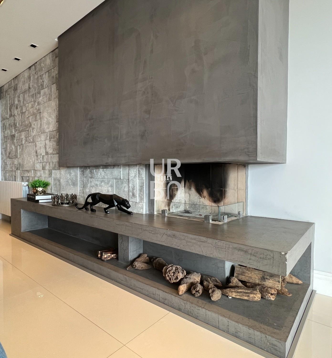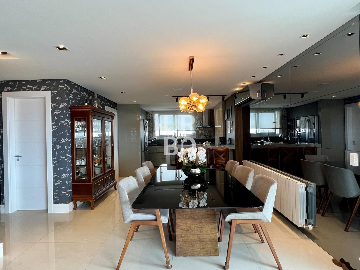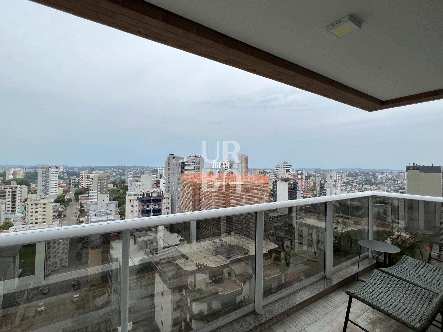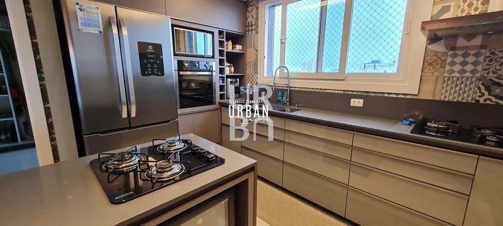 Descrição › Apartamento Vernazza Residensiale mobiliado e decorado, apenas 1 apartamento por andar, hall de entrada com porta blindada, andar alto com vista panorâmica para a cidade, possui 3 suítes, sendo 1 master com closet e hidromassagem, 5 banheiros, amplo living social com 3 ambientes, cozinha americana com churrasqueira, lareira a lenha, possui automação em todo apartamento e excelente posição solar e 4 vagas de garagem.