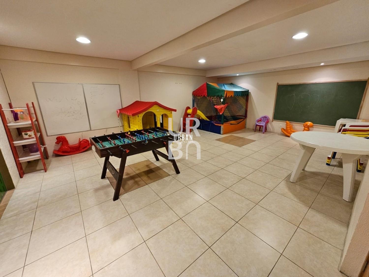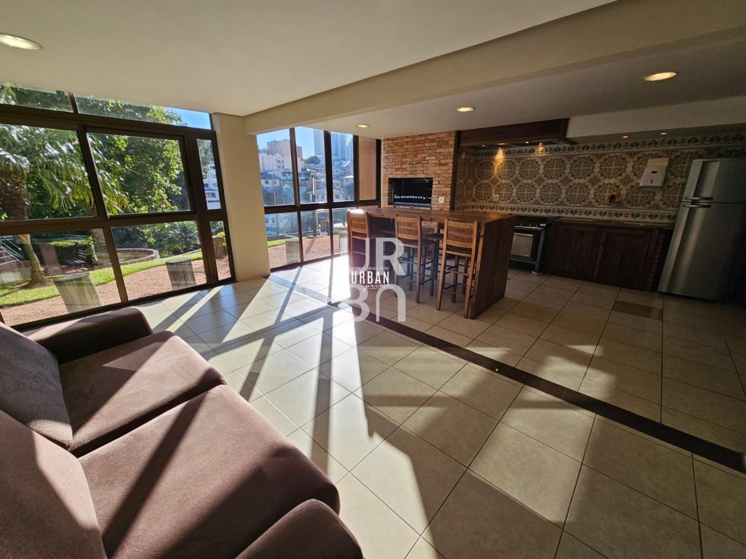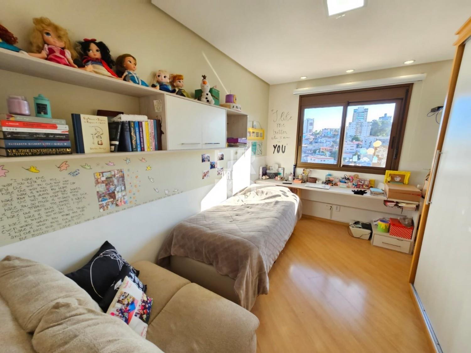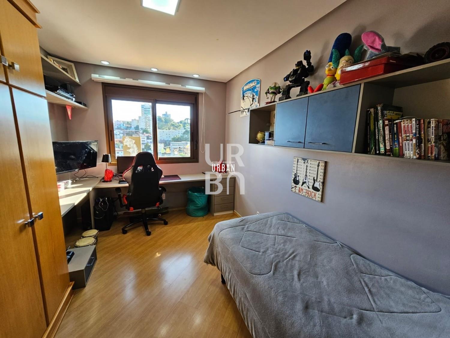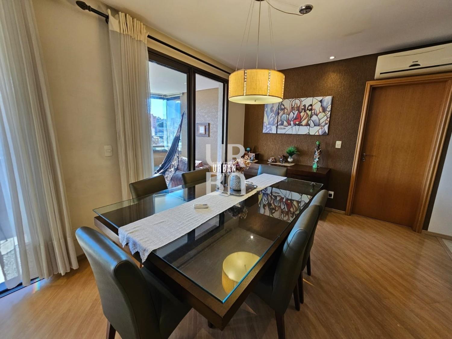 Descrição › Apartamento 3 dormitórios + gabinete. Uma suíte master, amplo ambiente social integrado de estar, jantar e cozinha, churrasqueira, sacada fechada, banheiro social e lavabo, lavanderia, split. Condomínio com excelente infraestrutura, 2 salões de festa, academia, mini quadra, jardim externo, playground, quiosques. Ótima localização próximo ao Foro e ao Quinta São Luis