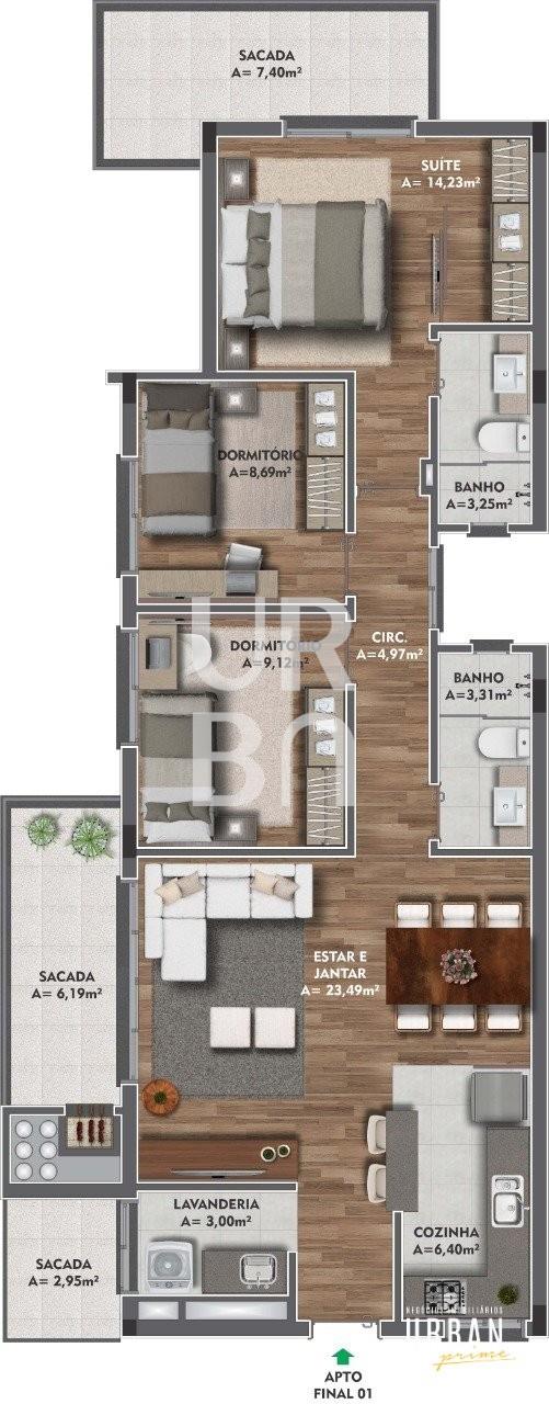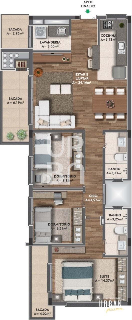 Descrição › Apartamento com 3 dormitórios, sendo 1 suíte com sacada, sala dois ambientes, sacada com churrasqueira, lavanderia com sacada.