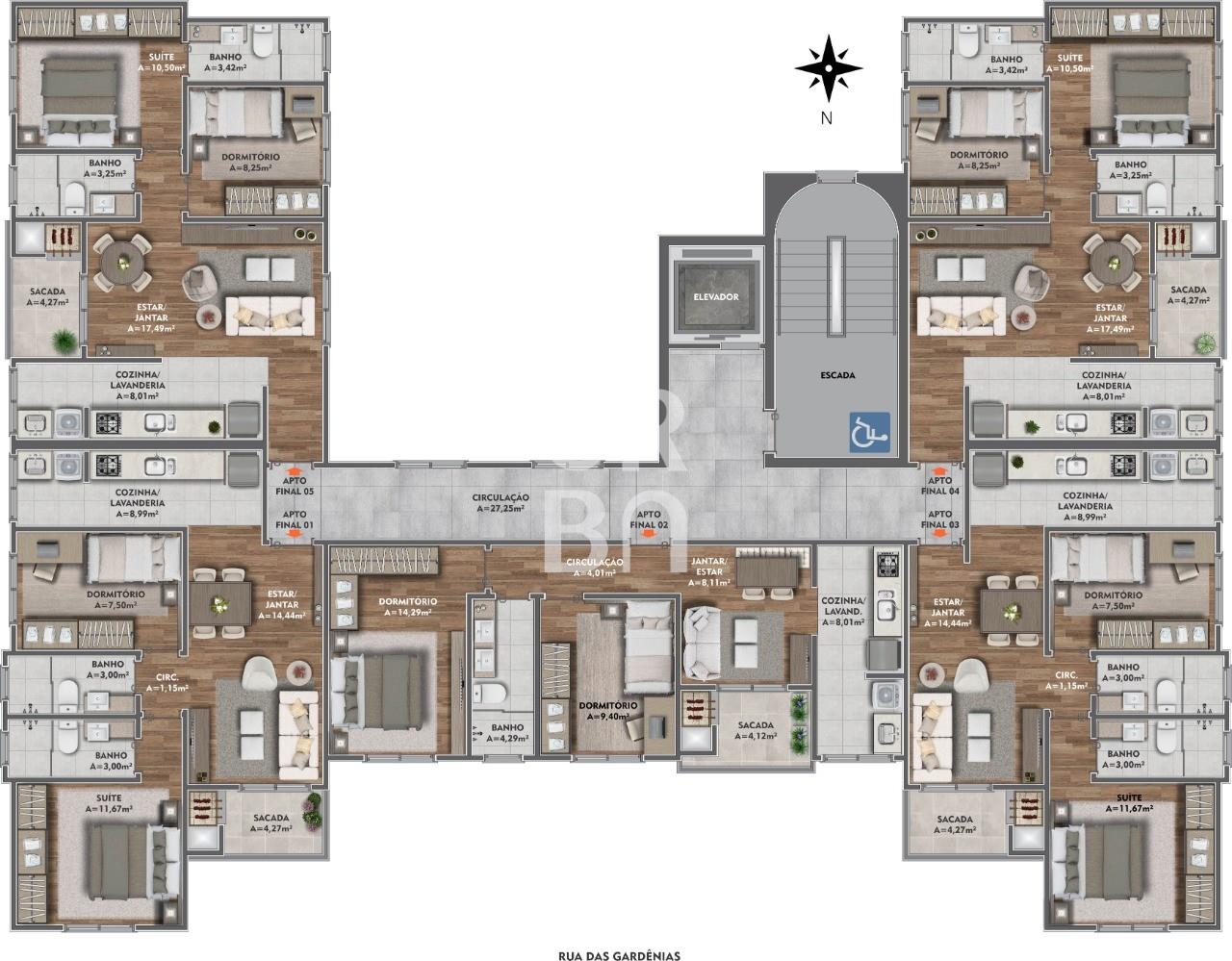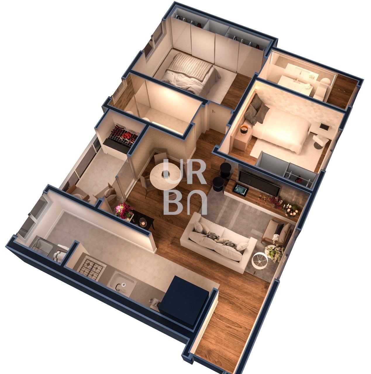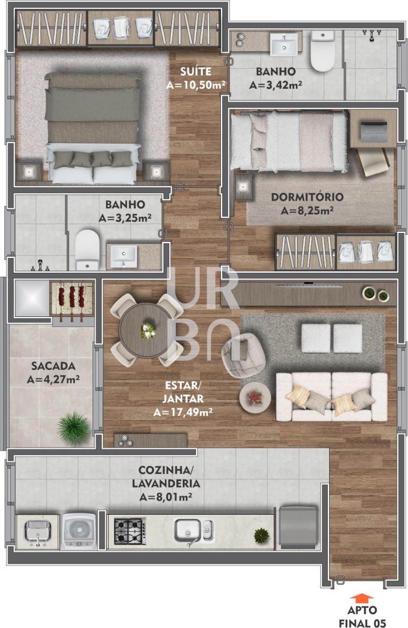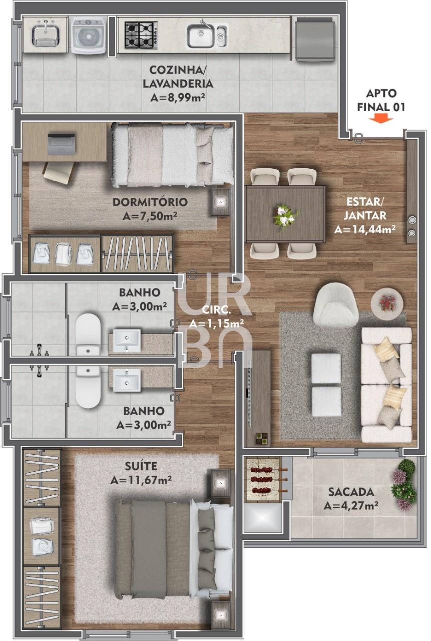 Descrição › Apartamento com 02 dormitórios, sendo 01 suíte, cozinha, área de serviço, salas de estar e jantar integradas, banheiro social, sacada com churrasqueira, 01 vaga de garagem.