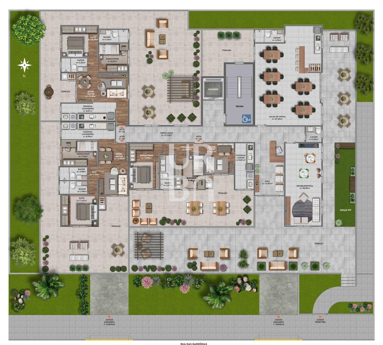 Condomínio com hall de entrada decorado, elevador, salão de festas, brinquedoteca.