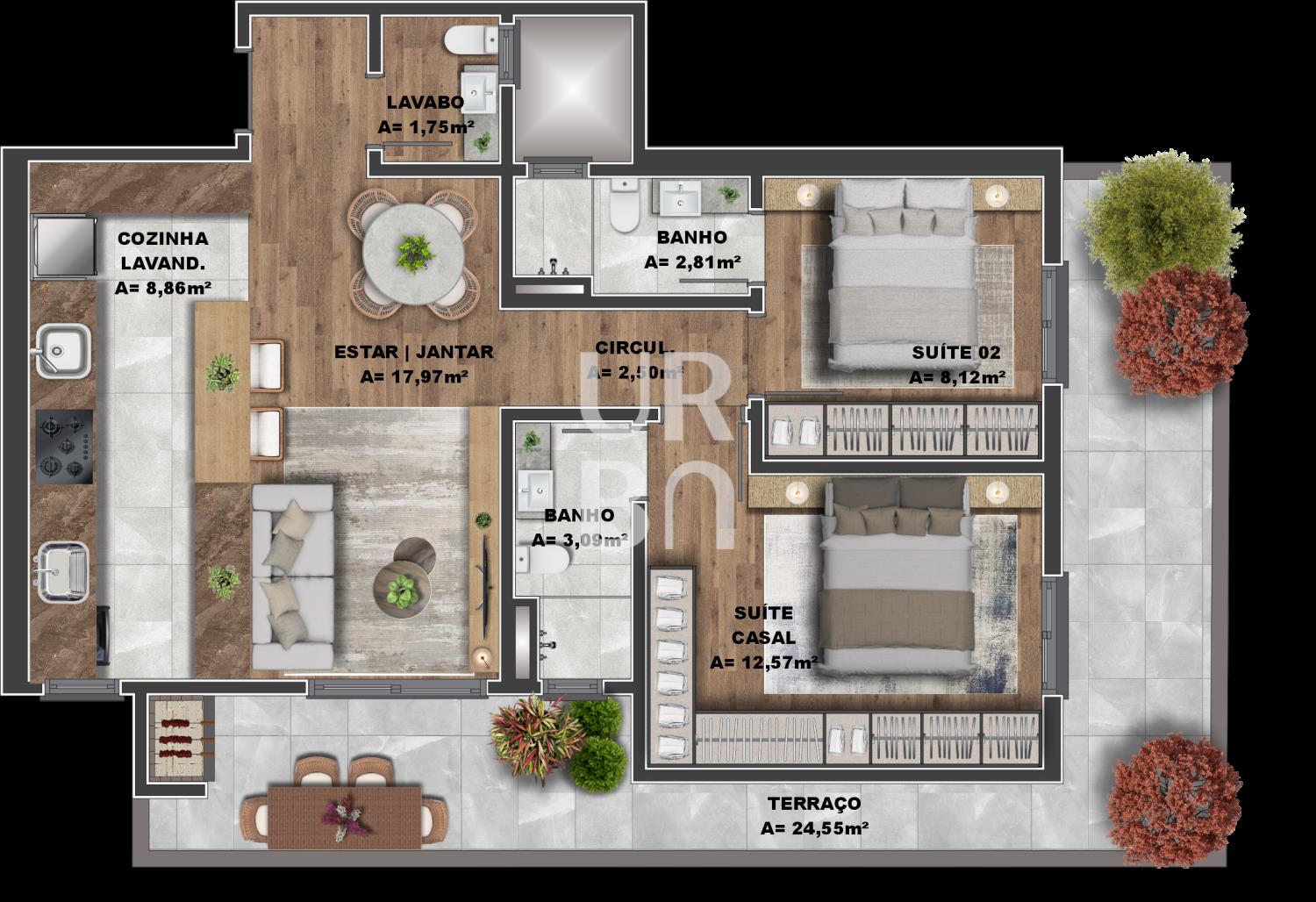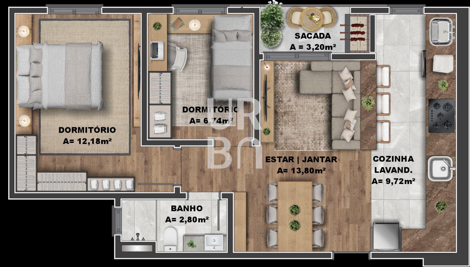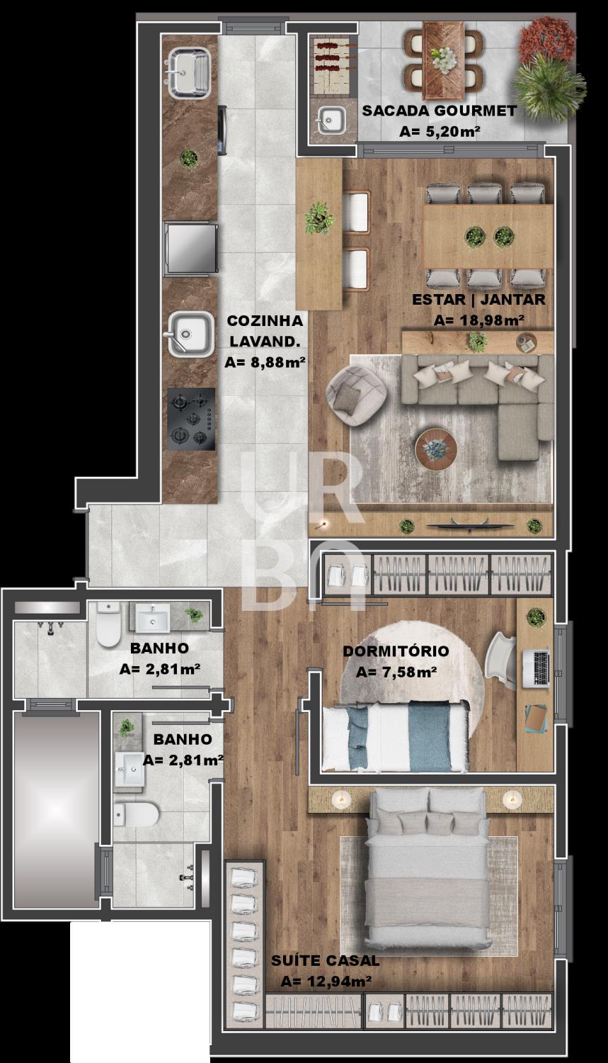 2 Dorm. | 1 Suíte(s) | 1 Box / Vaga(s)