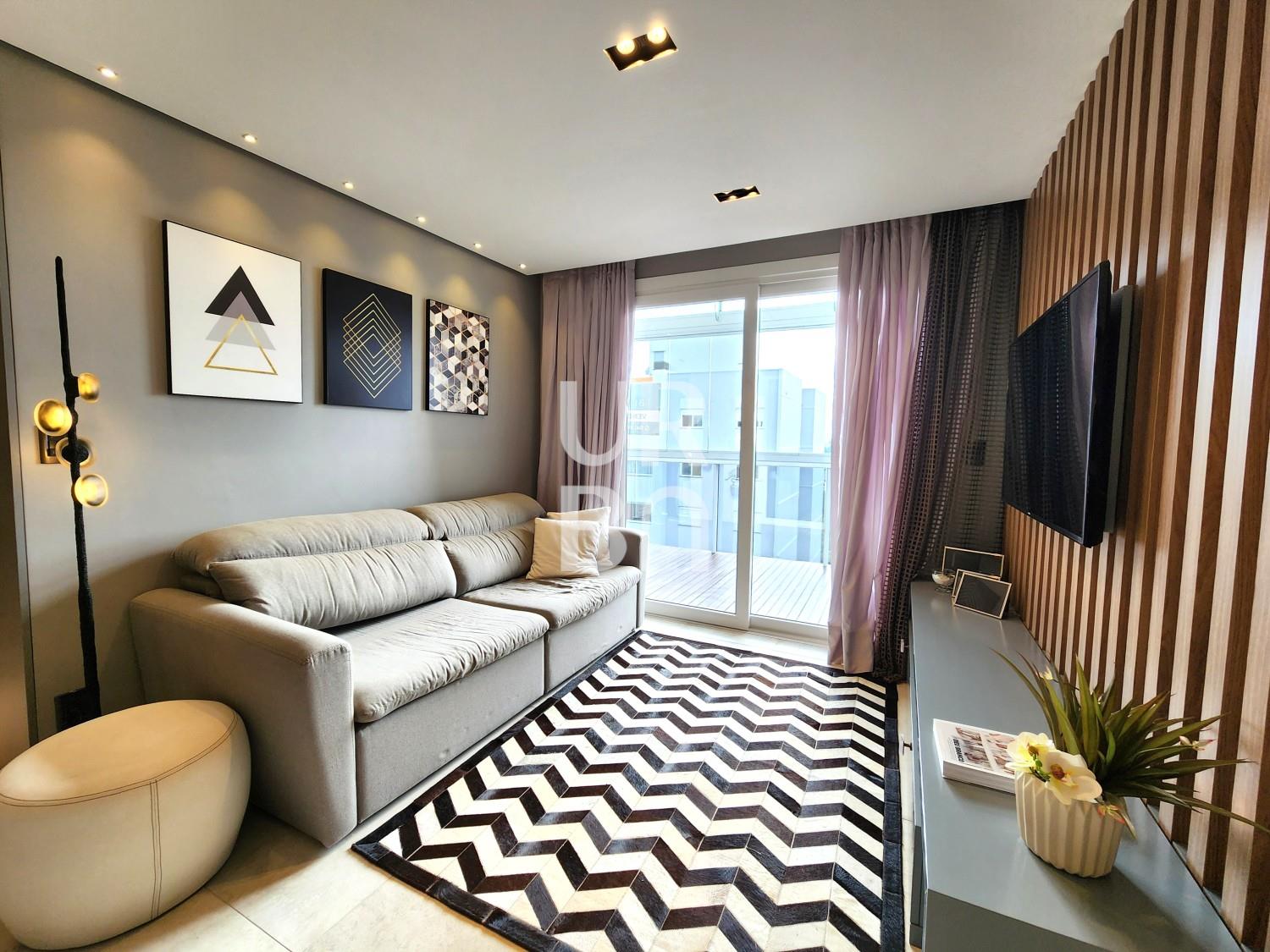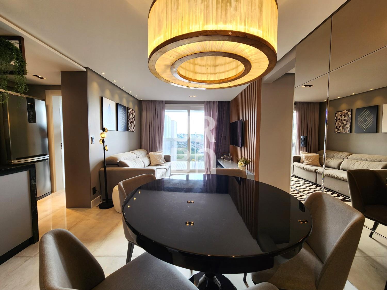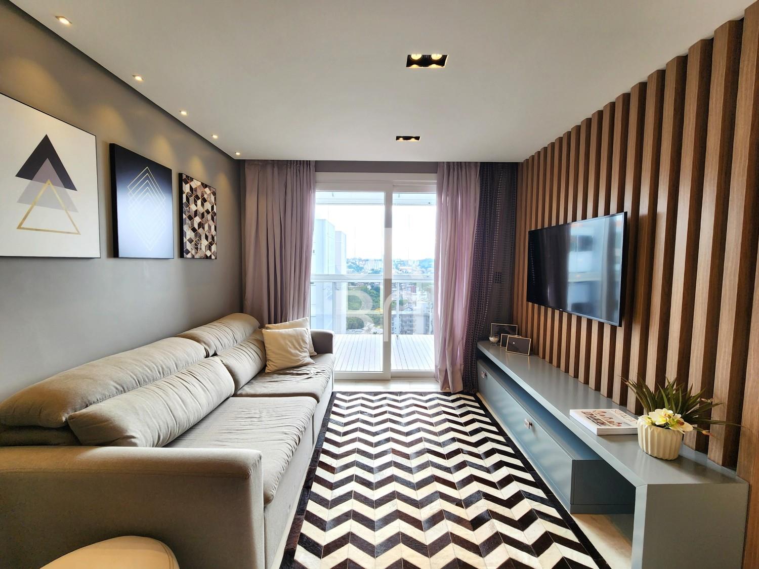 Descrição › Apartamento MOBILIADO e decorado no Bairro Panazzolo. 2 Dormitórios sendo 1 suíte, sala com 2 ambientes, cozinha integrada ao living, sacada fechada com churrasqueira. Todos os ambientes mobiliados. Vaga para dois carros.